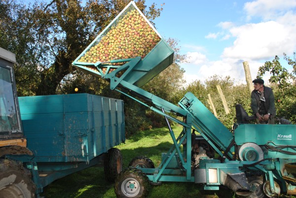 - La récolte s'effectue de la mi-octobre jusqu'à la fin novembre suivant les variétés, entre deux et trois passages à chaque arbre en fonction de la chute des fruits. Environ 75 tonnes de pommes par an sont récoltées.