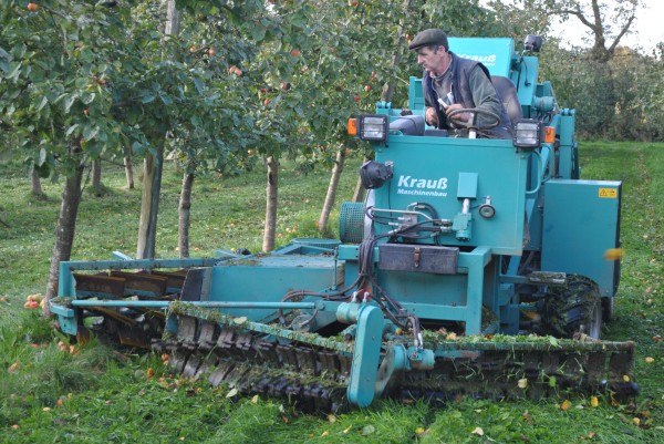 - À maturité, les pommes tombent sur l'herbe et la récolte peut commencer avec la ramasseuse.